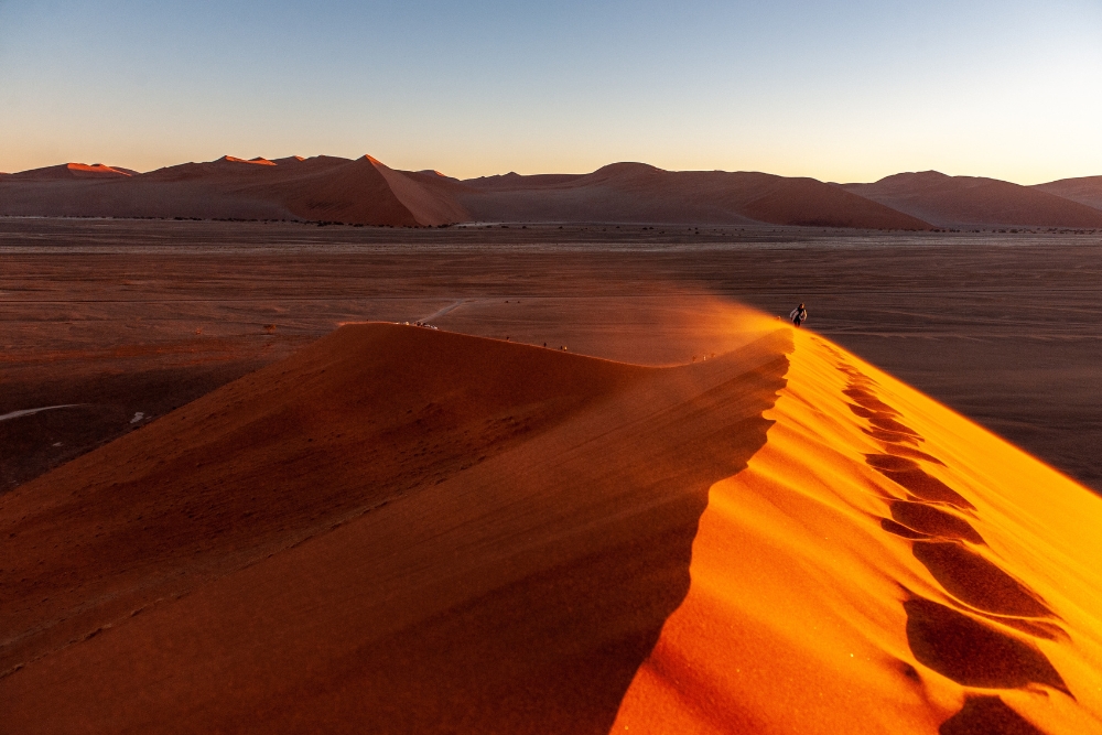 Sveglia all'alba e partenza per l’escursione alle dune di color albicocca di Sossusvlei. Ci dirigiamo al cancello del parco e da qui proseguiamo fino a raggiungere i campi di dune. Quelle che sembrano essere delle montagne nella fase che precede l’alba, con i raggi della prima luce si rivelano delle dune altissime e spettacolari. Il primo mattino è il momento migliore per esplorare le dune, la luce morbida offre eccellenti condizioni fotografiche, mentre il sole nascente crea profondità e contrasto. Quando termina la strada continuiamo la nostra esplorazione delle dune a piedi. Esploriamo Stark, punteggiato di antichi alberi camelthorn morti e circondati da imponenti dune arancioni. Il Namib abbonda con la vita. Reputato il più antico deserto del mondo il livello di adattamento degli animali, insetti e piante dà credito a questa affermazione. La vostra guida vi farà conoscere le meraviglie del Namib. Prima di tornare al lodge, esploriamo Sesriem canyon piccolo ma splendido. Resto del pomeriggio a disposizione. Pensione completa al Desert Hills Lodge.