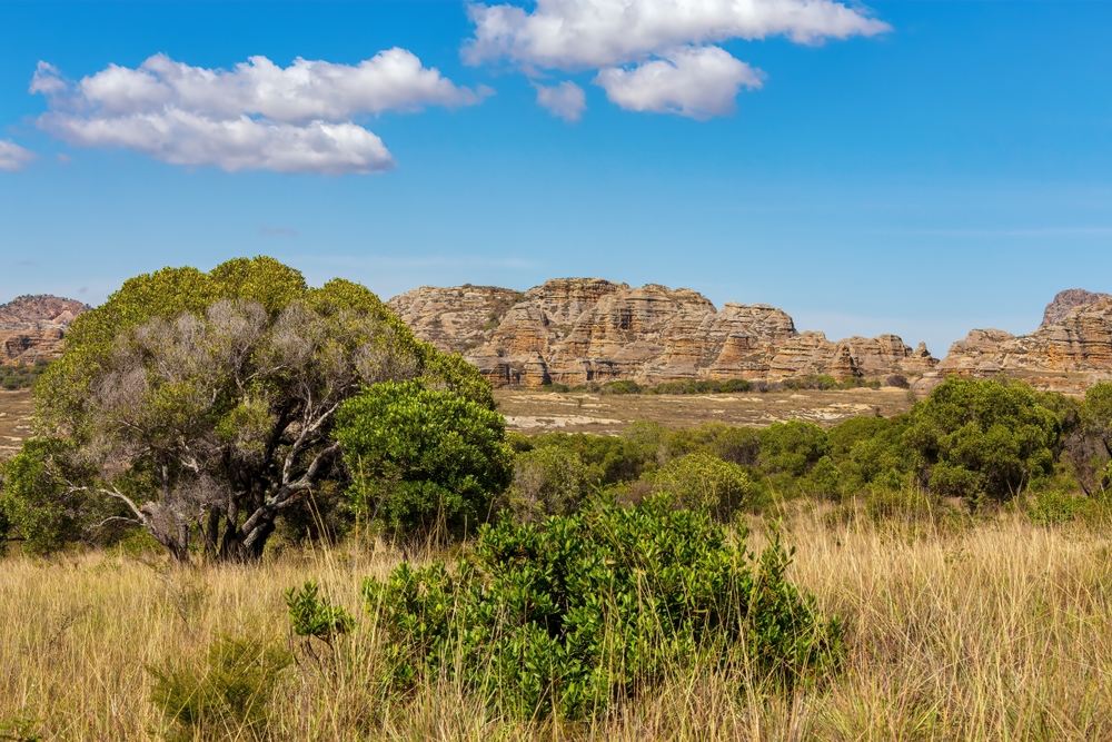 Isalo è classificato Parco Nazionale, con la convenzione dell’UNESCO nel 1962 e copre una superficie di 80.000 ettari; localizzato tra i 500 metri e i 1.200 metri di altitudine sopra il livello del mare, è un massiccio granitico che offre in un colpo d’occhio un uniforme rilievo in mezzo ad una prateria assomigliante la savana africana. Una totalità di flora endemica, particolarmente il “Pachypodium” e l’“Aloe” condividono il territorio dei lemuri, piccoli rettili, camaleonti, gechi, e varietà di insetti. Il parco contiene anche numerosi luoghi sacri degli abitanti locali, i Bara, che seppelliscono i loro morti nelle grotte dei canyon.