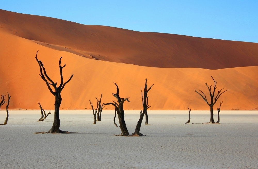 Sveglia all'alba e partenza per l’escursione alle dune di color albicocca di Sossusvlei. Ci dirigiamo al cancello del parco e da qui proseguiamo fino a raggiungere i campi di dune. Quelle che sembrano essere delle montagne nella fase che precede l’alba, con i raggi della prima luce si rivelano delle dune altissime e spettacolari. Il primo mattino è il momento migliore per esplorare le dune, la luce morbida offre eccellenti condizioni fotografiche, mentre il sole nascente crea profondità e contrasto. Quando termina la strada continuiamo la nostra esplorazione delle dune a piedi. Esploriamo Stark, punteggiato di antichi alberi camelthorn morti e circondati da imponenti dune arancioni. Il Namib abbonda con la vita. Reputato il più antico deserto del mondo il livello di adattamento degli animali, insetti e piante dà credito a questa affermazione. La vostra guida vi farà conoscere le meraviglie del Namib. Prima di tornare al lodge, esploriamo Sesriem canyon piccolo ma splendido. Resto del pomeriggio a disposizione. Pensione completa al Desert Hills Lodge.