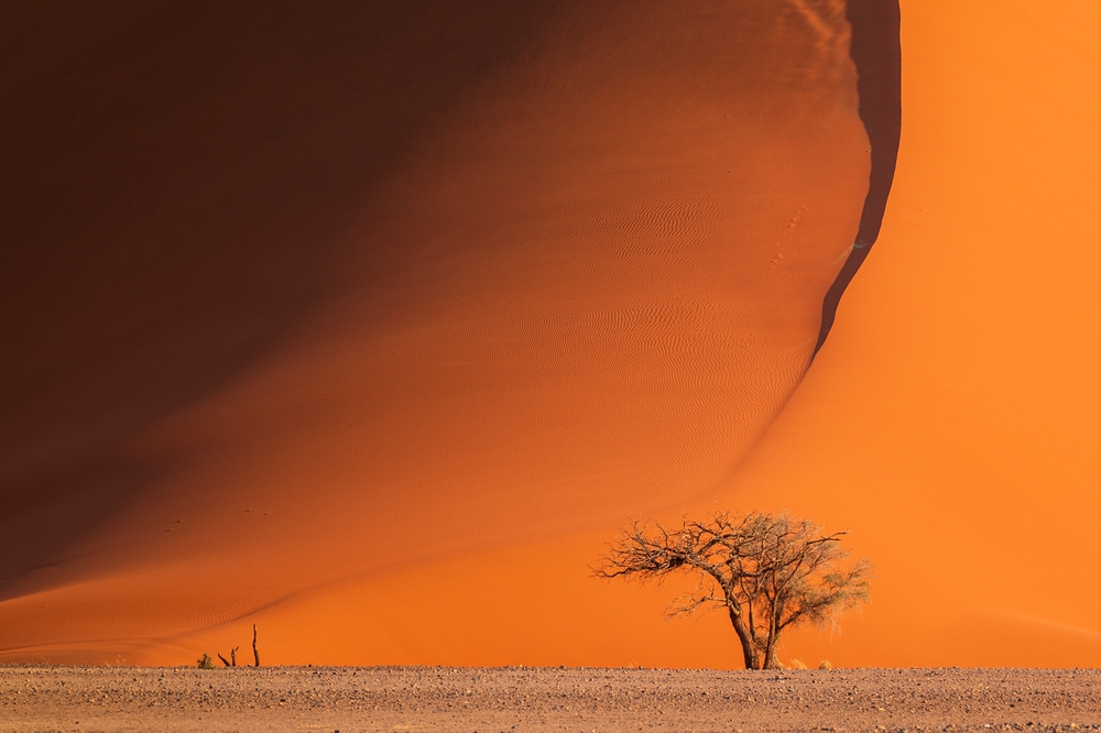Sveglia all'alba e partenza per l’escursione alle dune di color albicocca di Sossusvlei, con il nostro veicolo. Ci dirigiamo al cancello del parco e da qui proseguiamo fino a raggiungere i campi di dune. Quelle che sembrano essere delle montagne nella fase che precede l’alba, con i raggi della prima luce si rivelano delle dune altissime e spettacolari. Il primo mattino è il momento migliore per esplorare le dune, la luce morbida offre eccellenti condizioni fotografiche, mentre il sole nascente crea profondità e contrasto. Quando termina la strada continuiamo la nostra esplorazione delle dune a piedi.
